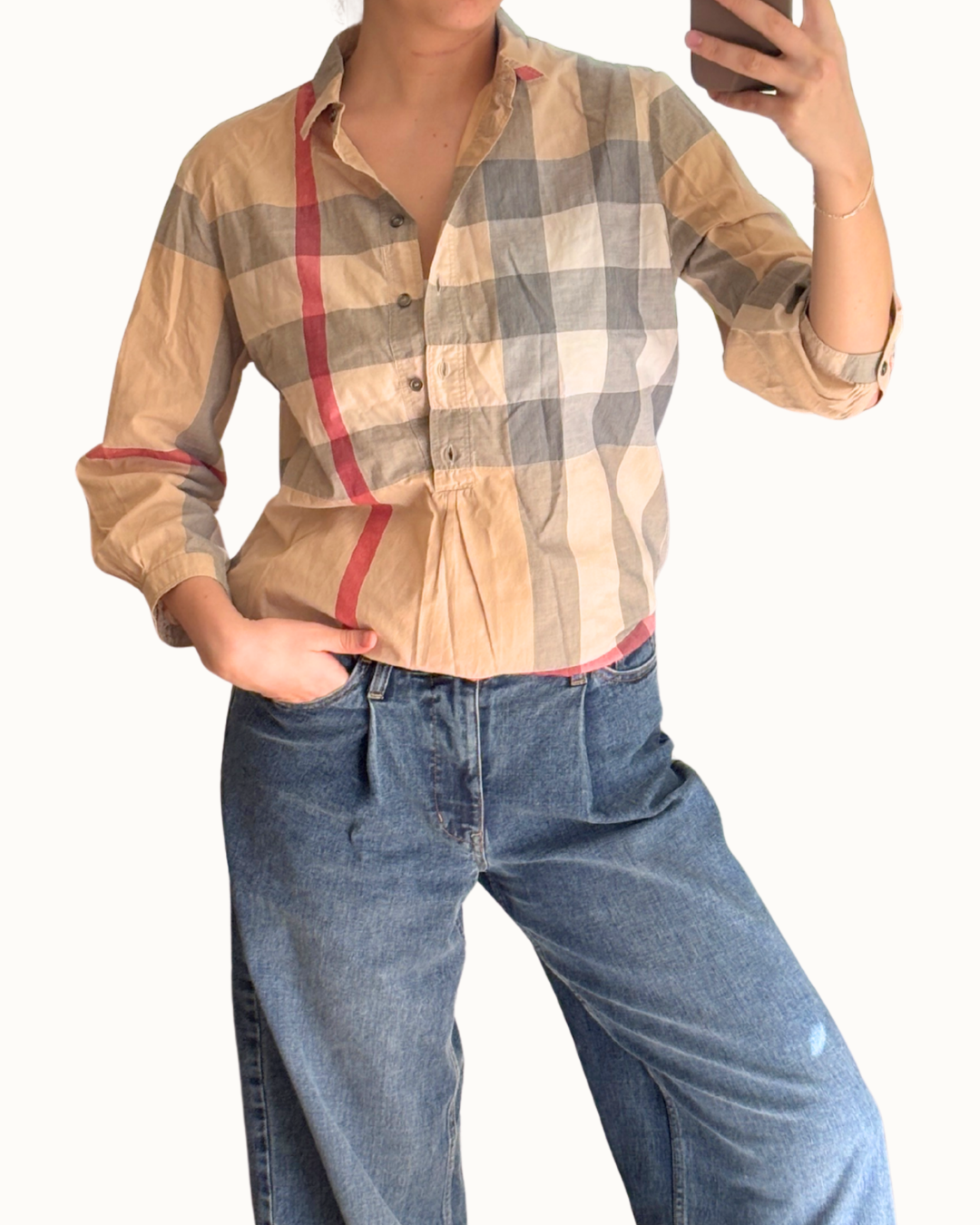 Burberry Plaid Print Three-Quarter Sleeve Button-Up Top